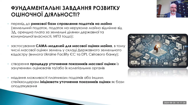 Завідувач кафедри землевпорядного проектування НУБіП України, професор Андрій Мартин детально розглянув питання розвитку законодавства у сфері оцінки земель та роль оцінювачів у впровадженні масової оцінки при справлянні плати за землю. Він підкреслив, що масова оцінка земель стане ключовим інструментом для ефективного управління земельними ресурсами та забезпечення справедливого оподаткування. Він звернув увагу на необхідність підвищення рівня прозорості та достовірності даних, що використовуються для оцінки земельних ділянок, та запропонував шляхи вдосконалення існуючих методів оцінки.
