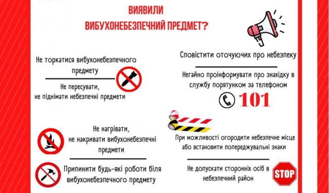 При виявлені вибухонебезпечних предметів негайно повідомте за номером «101»!
