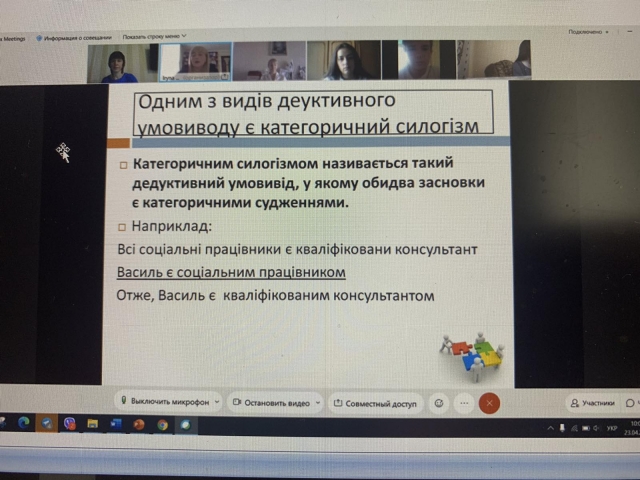 23 квітня 2021 року відбулася відкрита лекція доцента кафедри філософії та міжнародної комунікації Матвієнко І.С. для студентів 2 курсу гуманітарно-педагогічного факультету, спеціальності «Соціальна робота» з дисципліни «Логіка» на тему: «Умовиводи: індуктивні та за аналогією».