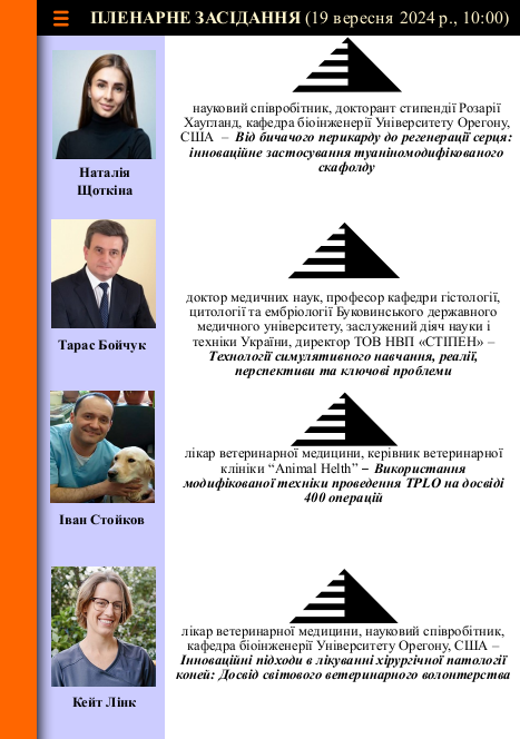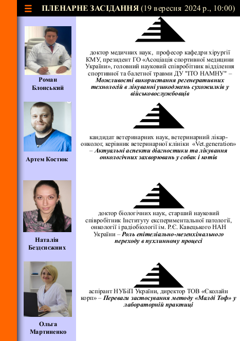 - Секція 1. Науково-практичні аспекти використання клітинних технологій у ветеринарній медицині за хірургічної патології. Робота секції присвячена 100-річчю кафедри ветеринарної хірургії ім. акад. І.О. Поваженка - конференц зала, ауд. 117, блок Г. Покликання для долучення онлайн: https://nubip-edu-ua.zoom.us/j/83285366988?pwd=mH6bkWJyJ9fCA7xxbMhv6xEF9L98qa.1