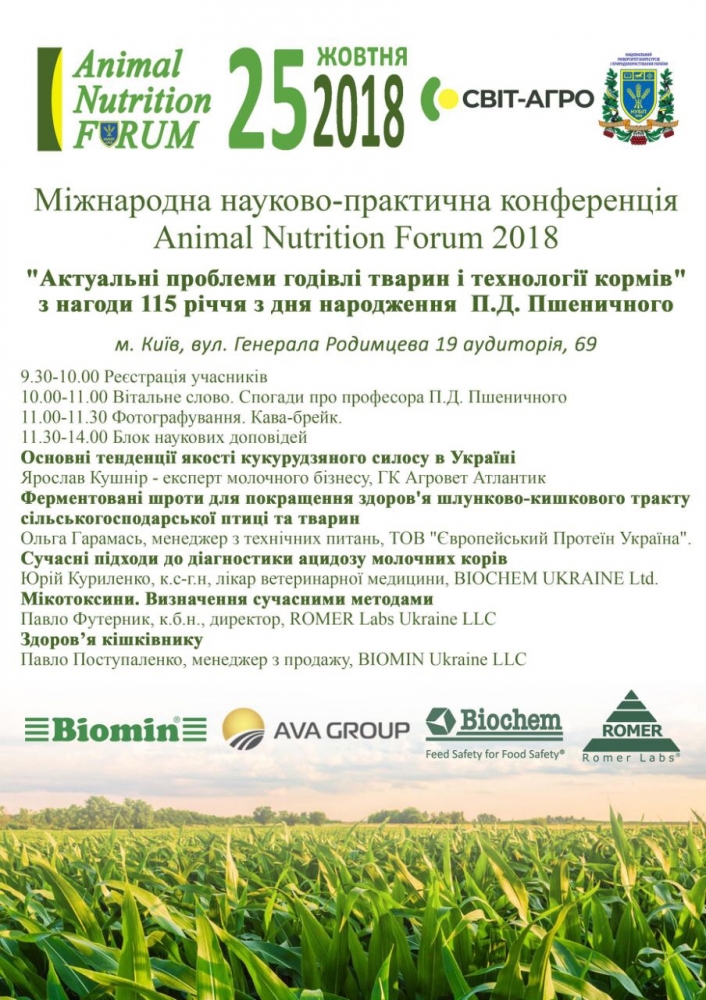 25 жовтня 2018 року кафедра годівлі тварин та технології кормів ім. П.Д. Пшеничного факультету тваринництва та водних біоресурсів спільно з ТОВ ТД «Світ Агро» проводять міжнародну науково-практичну конференцію «Animal Nutrition Forum 2018».