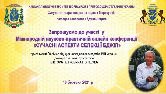 Запрошуємо Вас до участі в науково-практичній онлайн-конференції з міжнародною участю «СУЧАСНІ АСПЕКТИ СЕЛЕКЦІЇ БДЖІЛ», присвяченій 90-річчю від дня народження академіка ВО України, доктора с.-г. наук, професора В.П. Поліщука.