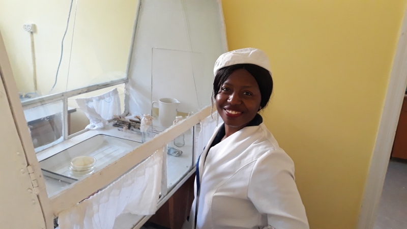 Марі Макінде перед роботою у бактеріологічному боксі