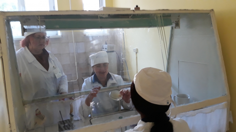 професори Т.В. Мазур і О.В.Яблонська показують Марі Макінде які живильні середовища використовуються для первинного бактеріологічного дослідження.