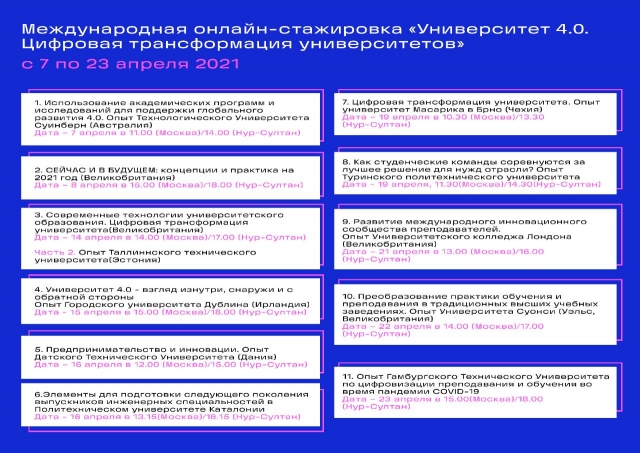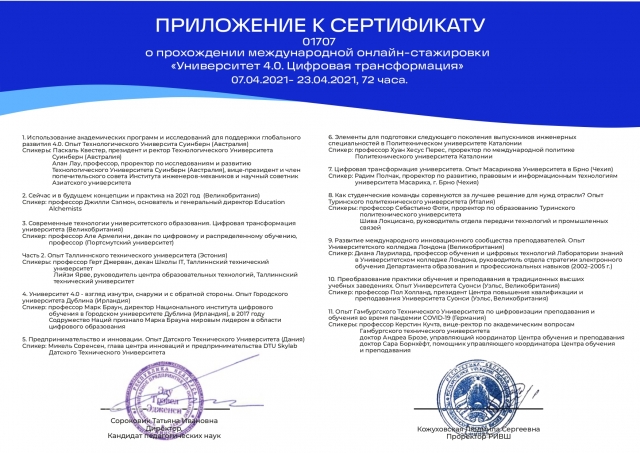 В рамках стажування відбулося 11 онлайн-зустрічей з професорами провідних зарубіжних університетів, кращими фахівцями у секторі освіти та організації її зв'язку з виробництвом, досліджень проблем впливу Індустрії 4.0 на освіту. Фахівці світового рівня в галузі вищої освіти ділилися баченням ключових концепцій розвитку освіти та їх практичним застосуванням в рамках концепції “Освіта 4.0” (Gilly Salmon). Також було розглянуто обширне коло питань присвячених особливостям організації та впровадження передових підходів у трансформації, організації та імплементації освітніх технологій в практичному вимірі.