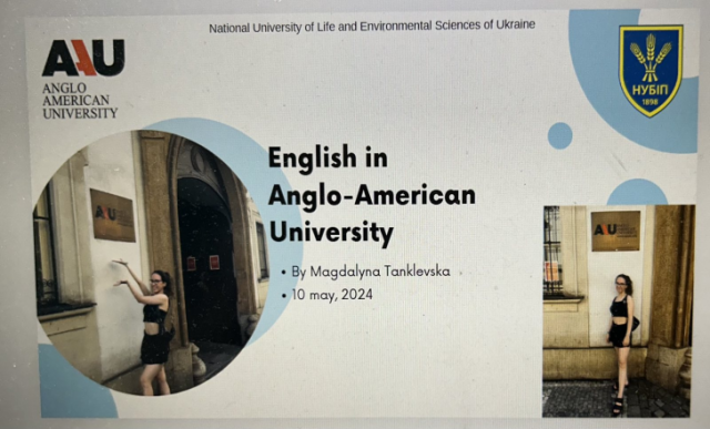 Студентка 1 курсу економічного факультету Магдалина ТАНКЛЕВСЬКА, яка наразі перебуває на навчанні за програмою Erasmus+ в Англо-Американському Університеті поділилася з учасниками вебінару своїм досвідом вивчення англійської мови в Україні та за кордоном. Вона розповіла про те, як вона готувалася до навчання за програмою Erasmus+, а також про те, як вона адаптувалася до нового мовного середовища.