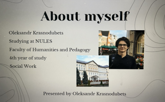 Олександр розпочав свій виступ з розповіді про те, як він прийняв рішення навчатися в Польщі. Він поділився своїми враженнями від процесу вступу, адаптації до нового середовища та навчання в польському університеті. Він володіє польською та англійською мовою на рівні B2 і також зазначив, що навчання за кордоном дало йому можливість познайомитися з людьми з різних країн світу, розширити свій кругозір та покращити свої мовні навички. Олександр здобув цінний досвід волонтерської роботи та стажування в польських соціальних організаціях.