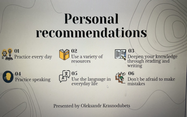 Магдалина дала слушні поради учасникам вебінару щодо того, як вивчити англійську мову та досягти успіху в навчанні за кордоном. Вона зазначила, що їй допомагають покращити навички англомовного спілкування такі фактори як: