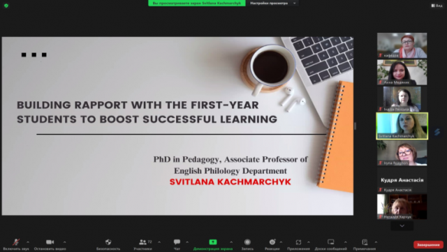 Наступною з доповіддю виступила кандидат педагогічних наук, доцент кафедри англійської філології Світлана КАЧМАРЧИК, яка поділилася власним досвідом налагодження контактів між викладачем і студентами першого курсу та шляхами створення сприятливої атмосфери для вивчення англійської мови.