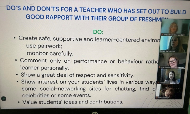 Викладачка надала кілька практичних рекомендацій щодо того, як налагодити взаємозв’язок зі студентами першого курсу, оскільки саме через успішне педагогічне спілкування у студентів виникає мотив самоосвіти та професійного самовиховання, бажання вивчати англійську мову і брати активну участь у науково-дослідній роботі.