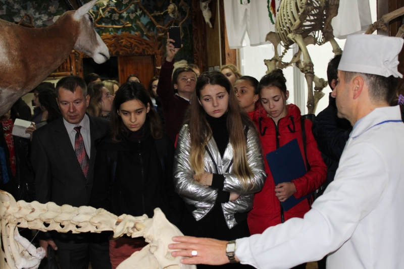 Заступники декана Василь Данілов, Сергій Деркач та Юрій Жук провели екскурсію факультетом і ознайомили абітурієнтів з фундаментальними та клінічними кафедрами. Особливий інтерес викликав у абітурієнтів відвідування кафедри анатомії, гістології і патоморфології тварин ім. акад. В.Г. Касьяненка, де були продемонстровані пластиновані препарати та музей анатомії.