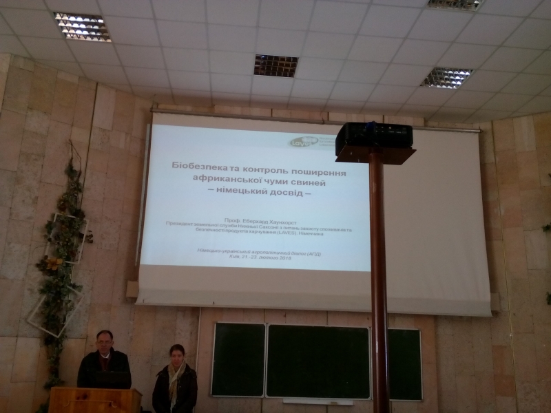 Професор Еберхард Хаунхорст розказав про структуру та завдання своєї служби; про профілактичні заходи, які проводить Німеччина для того, щоб недопустити занесення АЧС на територію країни; про заходи біобезпеки на підприємствах; про програму раннього розпізнавання та моніторингу у домашніх свиней; про план заходів та тренування, які проводить його служба на випадок занесення АЧС та інше.