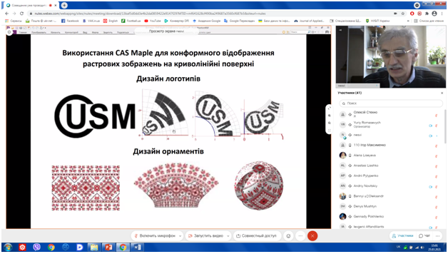 Доволі цікаву доповідь про використання CAS MAPLE в графічному дизайні запропонував професор Віктор Несвідомін. Він поділився досвідом застосування математичного апарату та програмного забезпечення для його реалізації для нанесення зображень на поверхні із кривиною. Такі підходи дають змогу на високому рівні розв’язувати досить складні дизайнерські задачі.