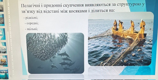 Проілюстрували промислові скупчення, вивчили основні характеристики промислових скупчень. Було лектором зазначено, що донні скупчення не реєструє гідроакустична оптика і про їх структуру судять за результатами контрольних обловів.Окремо студентів дуже зацікавили пелагічні і придонні скупчення, які виявляються за структурою у зв’язку від відстані між косяками і ділиться на кілька скупчень (рідкісні, середні та щільні).