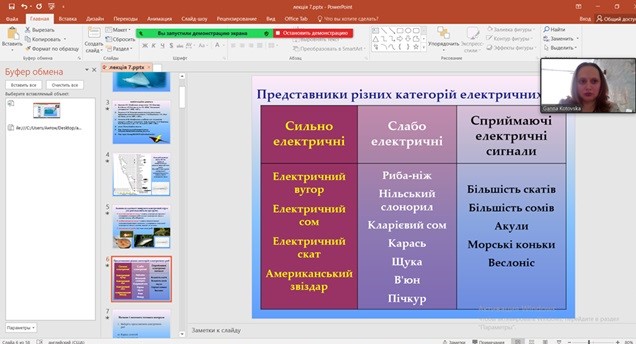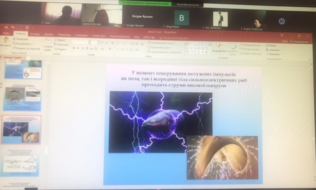 Лектор наочно проілюструвала частку електричних риб у загальній кількості біоресурсів гідросфери, подала чіткі роз’яснення щодо електричних рецепторів, еклектрогенераторів і видів електричних розрядів у риб. Окремо студентів дуже зацікавило прикладене застосування цих властивостей у господарській діяльності людини.