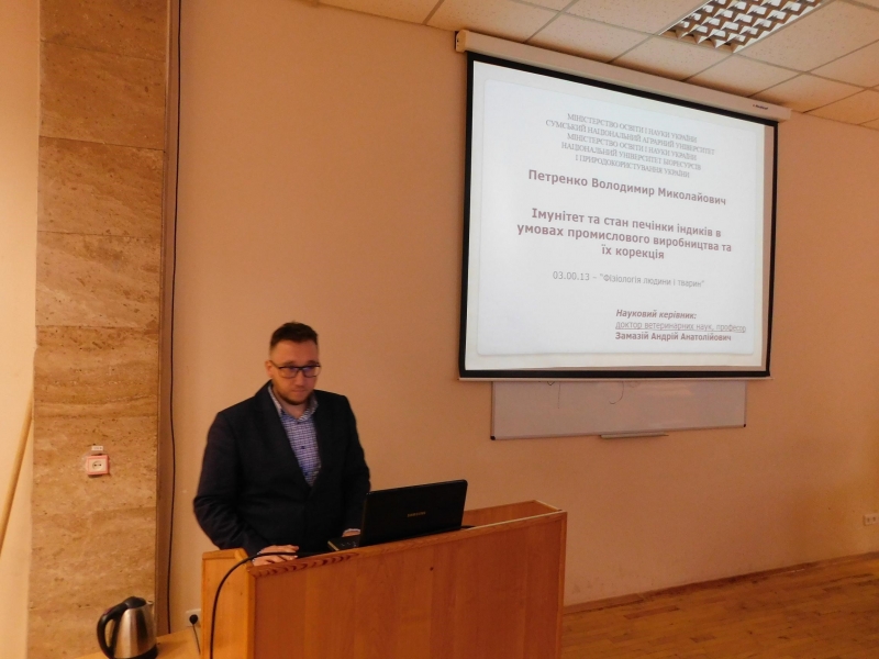 Питання №2 – розгляд дисертаційної роботи Петренка Володимира Миколайовича, здобувача кафедри анатомії, нормальної та патологічної фізіології Сумського НАУ, на тему «Імунітет та стан печінки індиків в умовах промислового виробництва та їх корекція», поданої на здобуття ступеня кандидата ветеринарних наук за спеціальністю 03.00.13 «Фізіологія людини і тварин». Головував на засіданні професор Засєкін Д. А. (голова ради).