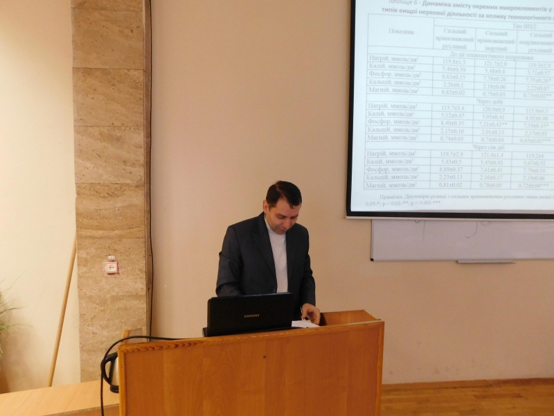 Питання №1 – розгляд дисертаційної роботи Кравченко-Довгої Юлії Володимирівни, здобувача кафедри біохімії і фізіології ім. акад. М. Ф. Гулого НУБіП України, на тему «Кортикальна регуляція мінерального статусу організму корів», поданої на здобуття ступеня кандидата ветеринарних наук за спеціальністю 03.00.13 «Фізіологія людини і тварин». Головував на засіданні професор Засєкін Д. А. (голова ради).