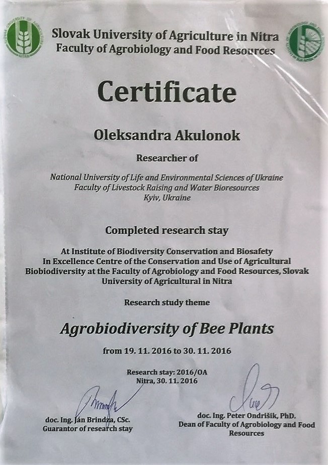 71 Всеукраїнська науково-практична студентська конференція «Сучасні технології у тваринництві та рибництві: навколишнє середовище – виробництво продукції – екологічні проблеми», Київ, доповідь – «Використання бджолиного обніжжя в оздоровчому харчуванні» |
