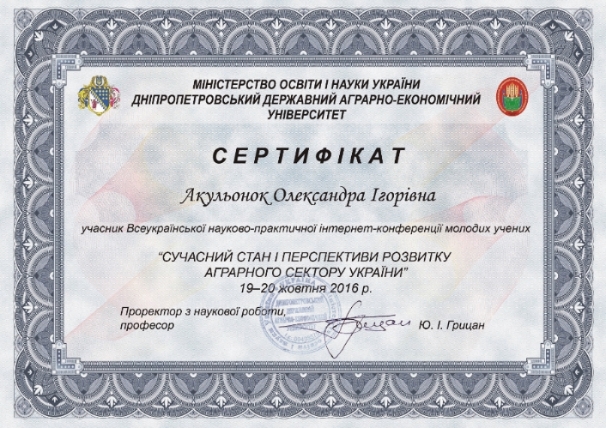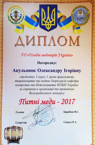 У цьому році рішенням конкурсної комісії Національного університету біоресурсів і природокористування України Олександра Акульонок рекомендована для участі у ІІ турі Всеукраїнського конкурсу студентських наукових робіт з галузі знань «Технологія виробництва і переробки продукції тваринництва».