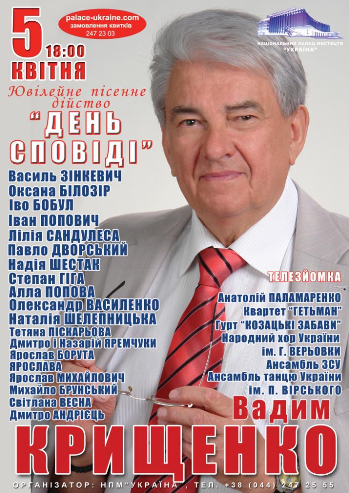 Вже 5 квітня цього року у Національному палаці мистецтв "Україна" відбудеться пісенне дійство "День сповіді", де вам буде співати сам Вадим Дмитрович.
