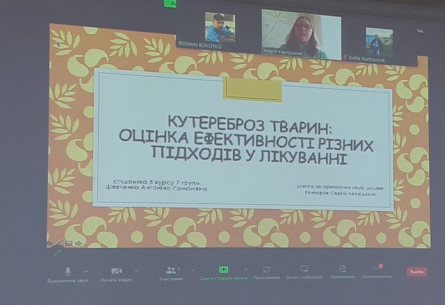 Гуртківець Мельніченко Ілля виступив із доповіддю на тему «Арахнози змій приватних тераріумів». У своїй роботі він висвітлив особливості діагностики та лікування паразитарних хвороб змій, які утримуються в умовах тераріуму. Студентка 5 курсу Шевченко Антоніна представила доповідь «Кутереброз тварин: оцінка ефективності різних підходів у лікуванні». Дослідження було спрямоване на порівняльний аналіз методів терапії уражень, спричинених личинками оводів-кутеребр.