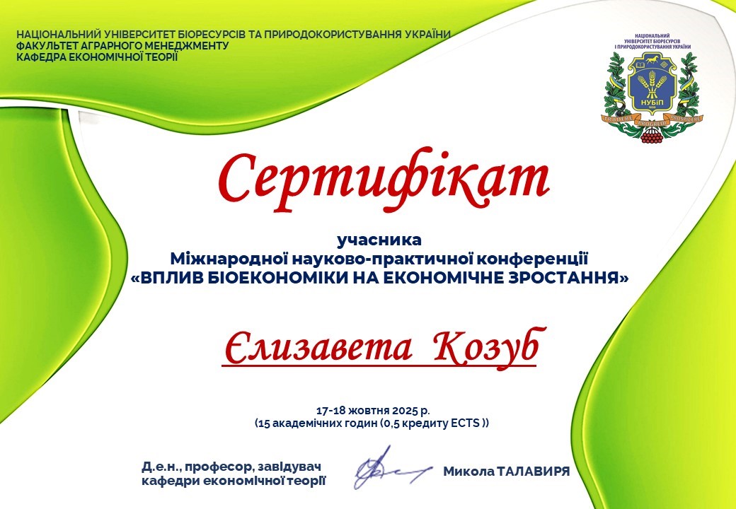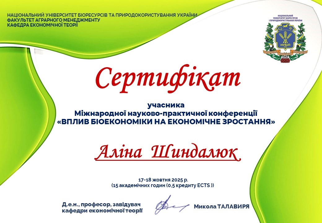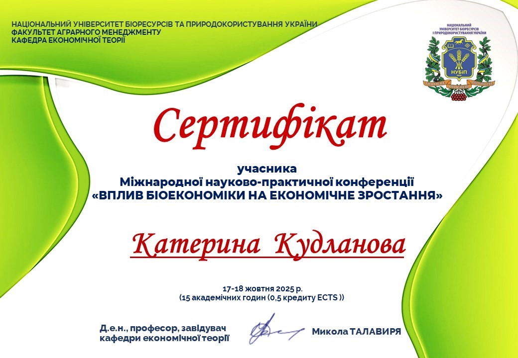 – IХ Міжнародній науково-практичній конференції «ІНКЛЮЗИВНИЙ РОЗВИТОК НАЦІОНАЛЬНОЇ ЕКОНОМІКИ: ГЛОБАЛЬНІ ТЕНДЕНЦІЇ, МОЖЛИВОСТІ УКРАЇНИ ТА РОЛЬ АГРОПРОДОВОЛЬЧОГО СЕКТОРУ, ДОСВІД І СПІВПРАЦЯ З ЄС», яка відбулася 21-22 жовтня 2025 р. За результатами проведення конференції були опубліковані тези доповідей у збірнику матеріалів конференції.