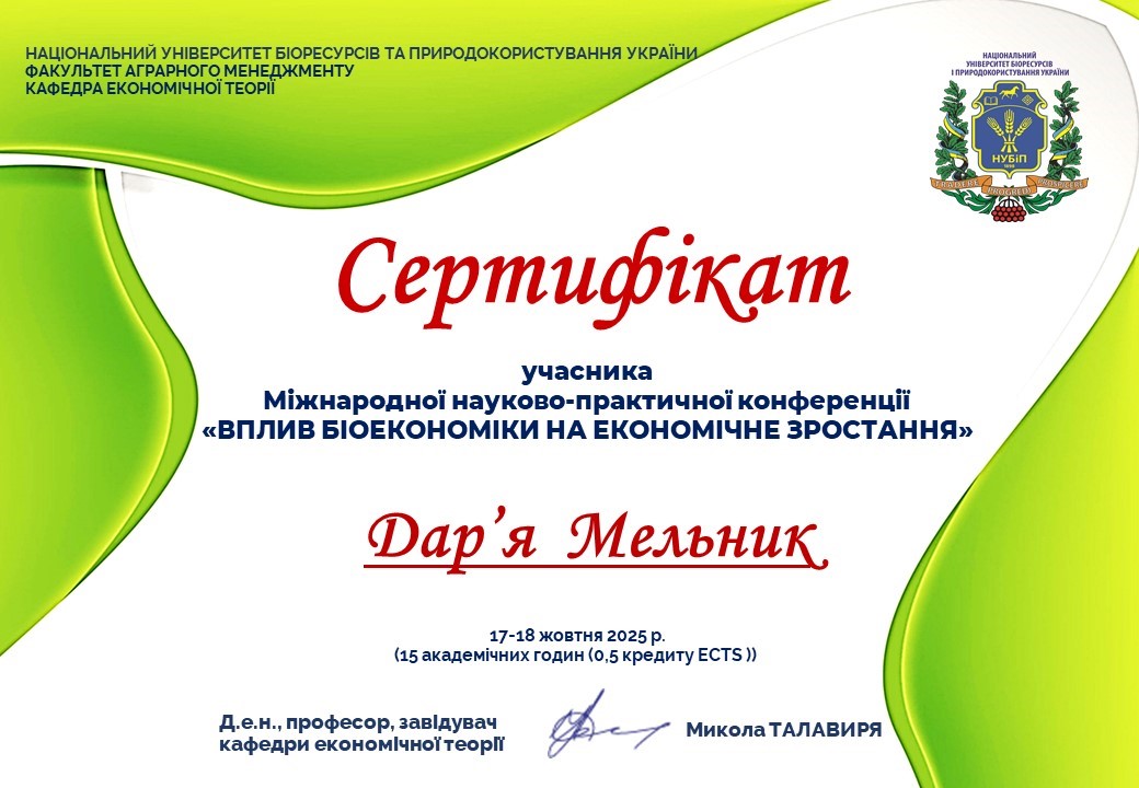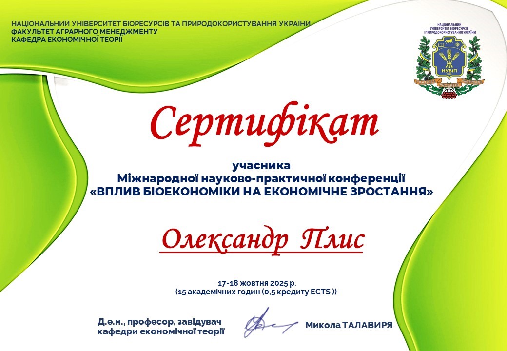 – Міжнародна науково-практична конференція «ВПЛИВ БІОЕКОНОМІКИ НА ЕКОНОМІЧНЕ ЗРОСТАННЯ», яка відбулася 17-18 жовтня 2025 року. За результатами проведення конференції були опубліковані тези доповідей у збірнику матеріалів конференції.