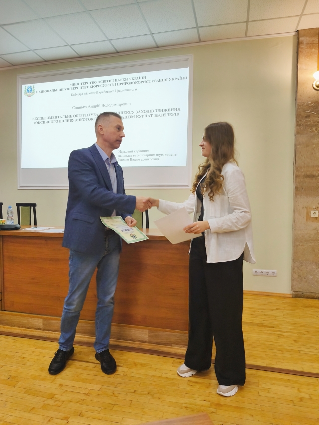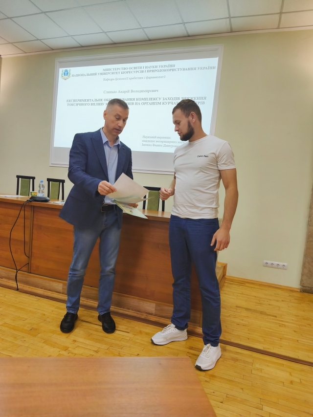 Наступним питанням був розгляд результатів дисертації здобувача наукового ступеня доктора філософії Андрія Слинька на тему: «Експериментальне обґрунтування комплексу заходів зниження токсичного впливу мікотоксинів на організм курчат-бройлерів».