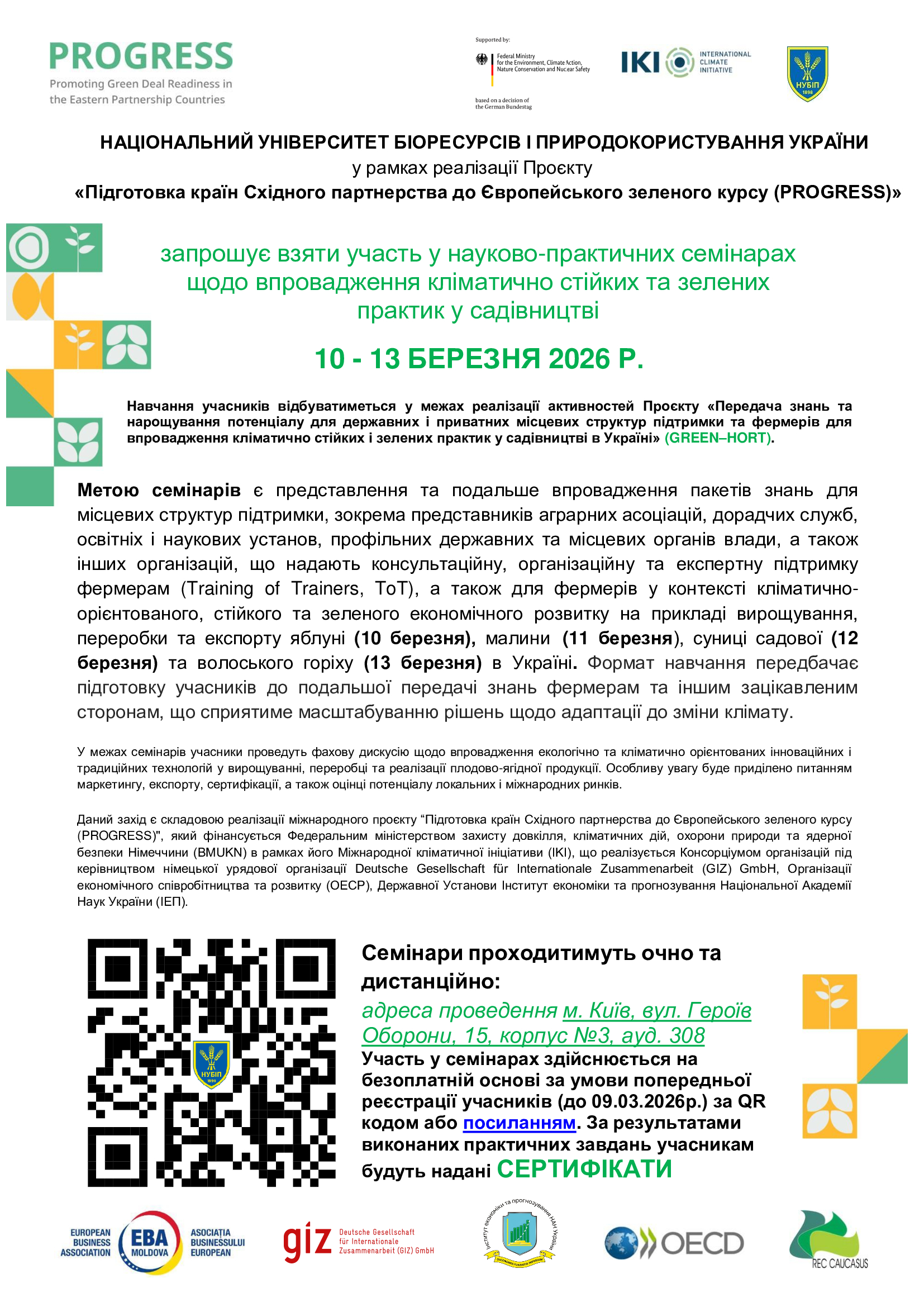 запрошує взяти участь у науково-практичних семінарах щодо впровадження кліматично стійких та зелених практик у садівництві