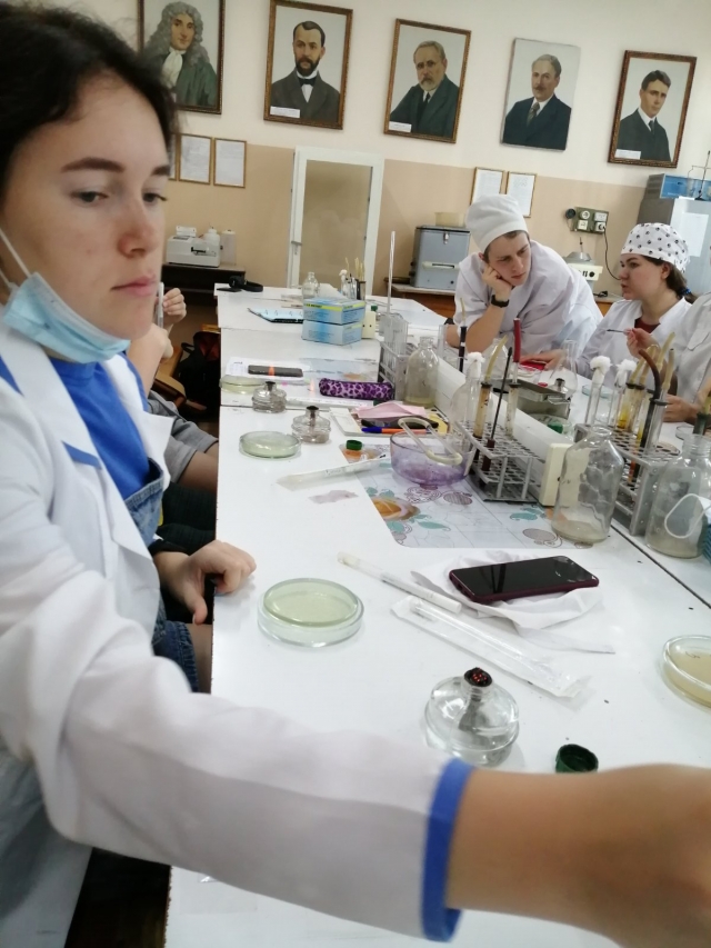 Студенти відбирають дослідний матеріал від тварин та з навколишнього середовища. Готують поживні середовища на яких роблять посіви з матеріалів що досліджують. Вивчають культуральні властивості та середовищах МПА, МПБ і Ендо, що виросли на чашках Петрі і пробірках. Вивчали морфологію отриманих культур і готували мікроскопічні препарати та фарбували за методом Грамма.