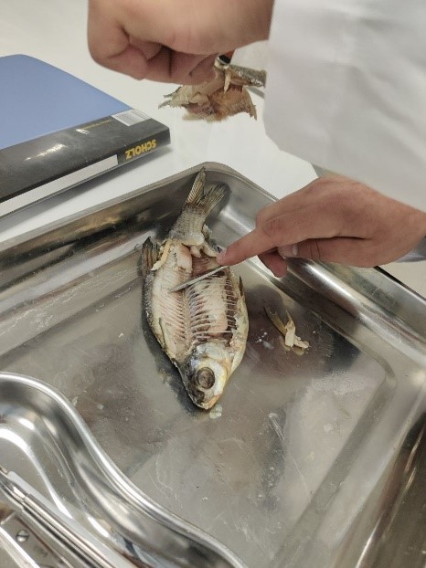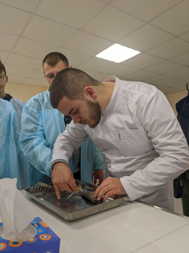 Розглядали будову кінематичних ланцюгів у риб, вивчали особливості їх роботи. Для цього відділяли осьовий скелет від м’язових тканин, це було ну дуже цікаво, досліджували його міцність і еластичність, також визначали співвідношення маси осьового скелета до загальної маси об’єкта, а в різних риб це все проходило за різним часом з різними розрахунками. Навіть робили УЗД особинам коропа-кої, це був ще той experience.