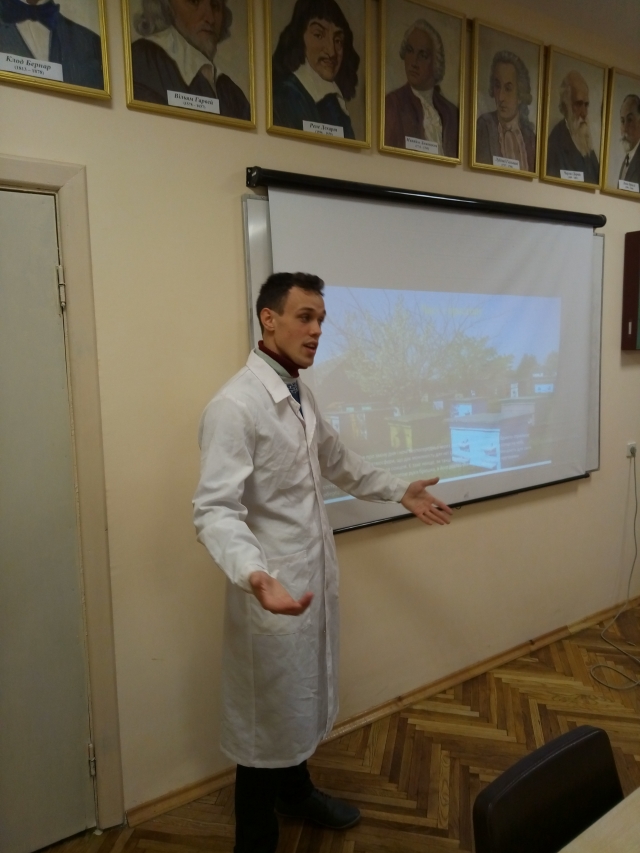Далі доповідач представив надзвичайно цікавий матеріал стосовно аналізаторів у бджіл: дотику, зору, нюху, смаку, температури, простору і часу. Доповідь видалась досить цікавою та інформативною. Студенти дізналися про те, що бджоли відчувають запах органами на останніх члениках вусика. Ці тварини, як виявляється, мають п’ять очей, два з яких фасеткові. Цікавим був факт про танці бджіл, за допомогою яких вони сповіщають членів вулика про потенційне джерело нектару чи небезпеки. До речі, Про танці бджіл та їх дослідника, нобелівського лавреата Карла фон Фріша нещодавно писала кафедра біохімії і фізіології тварин ім. акад. М. Ф. Гулого. Також Назарій розповів про механізми регуляції температурного режиму у зимовому клубі бджіл, органи чуттів на поверхні тіла, т. зв. «сенсили». Всі присутні студенти із захопленням слухали цікаву доповідь свого однокурсника. На основі сказаного виникло багато запитань не лише про аналізатори, а й узагалі про фізіологію цих напрочуд цікавих корисних комах. Найбільше вразило питання Іллі Здовбеля. Він запитав про те, яким чином зберігається сперма трутнів у спермотеці матки. Також звучали цікаві запитання щодо систем вуликів, способів зимівлі та розміщення різних рецепторів на тілі бджоли.