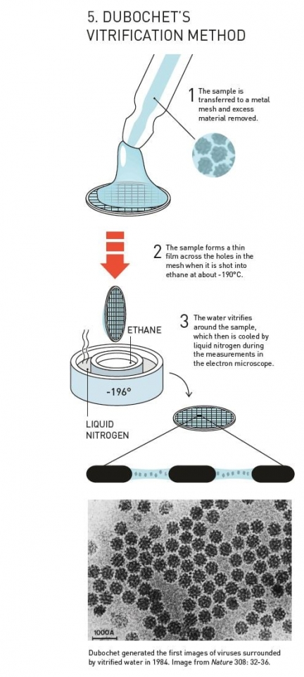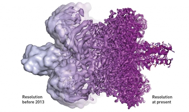 У 1984 році Жак Дюбоше опублікував перші зображення ряду різних вірусів, круглих і шестикутних, які різко контрастують на фоні осклованої води. Тепер біологічний матеріал можна було відносно легко підготувати для електронної мікроскопії, і незабаром дослідники постукали в двері Дюбошета, щоб вивчити нову техніку. Від блобології до революції Таким чином, найважливіші частини кріо-ЕМ були на місці, але зображення все ще мали низьку роздільну здатність. У 1991 році, коли Йоахім Франк підготував рибосоми за допомогою методу вітрифікації Дюбоше та проаналізував зображення за допомогою власного програмного забезпечення він отримав 3D-структуру з роздільною здатністю 40 Å. Це був дивовижний крок вперед для електронної мікроскопії, але зображення показало лише контури рибосоми. Чесно кажучи, це виглядало як крапля, і зображення навіть не наближалося до атомної роздільної здатності рентгенівської кристалографії.Оскільки кріо-ЕМ рідко міг візуалізувати щось, окрім нерівної поверхні, цей метод іноді називали «блобологією». Однак усі гайки й болти електронного мікроскопа поступово були оптимізовані, значною мірою завдяки Річарду Гендерсону, який уперто відстоював своє бачення, що електронна мікроскопія одного дня регулярно забезпечуватиме зображення окремих атомів. Роздільна здатність покращилася, Ångström за Ångström, і остання технічна перешкода була подолана в 2013 році, коли надійшов до використання новий тип детектора електронів (рис. 6).