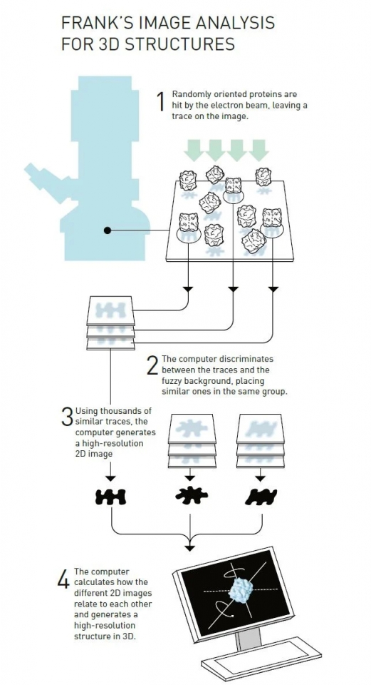 Рисунок 3. У 1990 році Хендерсон представив структуру бактеріородопсину в атомарному розділенні. Таким чином він довів, що кріо-ЕМ може надати зображення, настільки ж детальні, як ті, які були отримані за допомогою рентгенівської кристалографії, що стало вирішальною віхою. Однак цей прогрес був побудований на винятку: як білок природним чином регулярно упаковував себе в мембрану. Небагато інших білків спонтанно впорядковують себе таким чином. Питання полягало в тому, чи можна узагальнити метод: биЧи можливо використовувати електронний мікроскоп для створення 3D-зображень високої роздільної здатності білків, які були випадково розкидані у зразку та орієнтовані в різних напрямках? Річард Хендерсон вірив, що це буде, тоді як інші вважали, що це утопія.По інший бік Атлантики, в Департаменті охорони здоров’я штату Нью-Йорк, Йоахім Франк довго працював над пошуком вирішення саме цієї проблеми. У 1975 році він представив теоретичну стратегію, згідно з якою очевидно мінімальна інформація, знайдена в двовимірних зображеннях електронного мікроскопа, може бути об’єднана для створення тривимірного цілого з високою роздільною здатністю. На реалізацію цієї ідеї йому знадобилося більше десяти років.Френк вдосконалює аналіз зображеньСтратегія Йоахіма Франка (рис. 4) заснована на тому, що комп’ютер розрізняє сліди випадково розташованих білків та їх фон на нечіткому зображенні електронного мікроскопа. Він розробив математичний метод, який дозволив комп’ютеру ідентифікувати різні повторювані візерунки на зображенні. Потім комп’ютер відсортував схожі візерунки в одну групу та об’єднав інформацію в цих зображеннях, щоб створити усереднене, чіткіше зображення. Таким чином він отримав кілька двовимірних зображень з високою роздільною здатністю, які показували той самий білок, але під різними кутами. Алгоритми для програмного забезпечення були завершені в 1981 році.