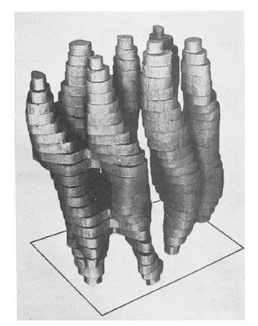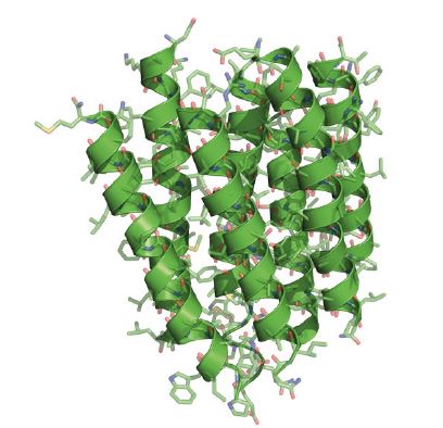 Рисунок 2. Перша груба модель бактеріородопсину, опублікована в 1975 році. Це було найкраще зображення білка, яке коли-небудь було отримано за допомогою електронного мікроскопа. Багатьох людей вразила роздільна здатність, яка становила 7 ангстрем (0,0000007 міліметрів), але Річарду Хендерсону цього було недостатньо. Його метою було досягти такої ж роздільної здатності, яку забезпечує рентгенівська кристалографія, приблизно 3 Ангстрема, і він був переконаний, що електронна мікроскопія може дати більше. Хендерсон створив перше зображення з атомною роздільною здатністю Протягом наступних років електронна мікроскопія поступово вдосконалювалася. Лінзи вдосконалювалися, розвивалася кріотехнологія (ми ще повернемося до цього), при якій під час вимірювань зразки охолоджувалися рідким азотом, захищаючи їх від пошкодження електронним променем.Річард Хендерсон поступово додавав більше деталей до моделі бактеріородопсину. Щоб отримати найчіткіші зображення, він подорожував до найкращих електронних мікроскопів у світі. Усі вони мали свої недоліки, але доповнювали одна одну. Нарешті, в 1990 році, через 15 років після того, як він опублікував першу модель, Хендерсон досяг своєї мети і зміг представити структуру бактеріородопсину в атомарному дозволі (рис. 3).
