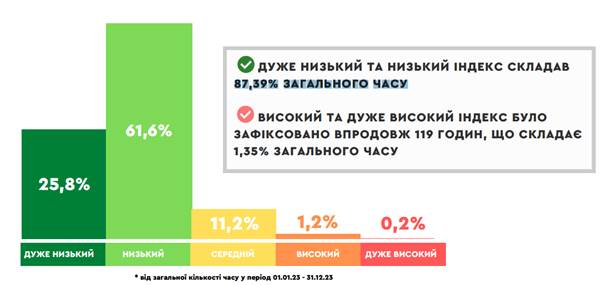 Результати моніторингових спостережень, отриманих на 46 індикативних і 7 референтних автоматичних станціях, презентував директор Департаменту Олександр Возний. За його словами з1 січня по 31 грудня 2023 року якість атмосферного повітря в Києві була прийнятної якості тобто87,39% загального часу (рис. 1).
