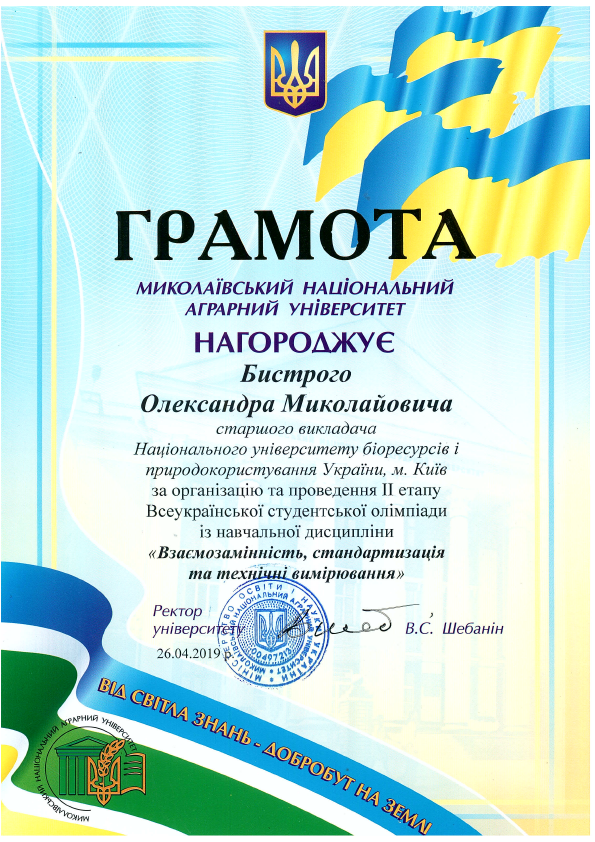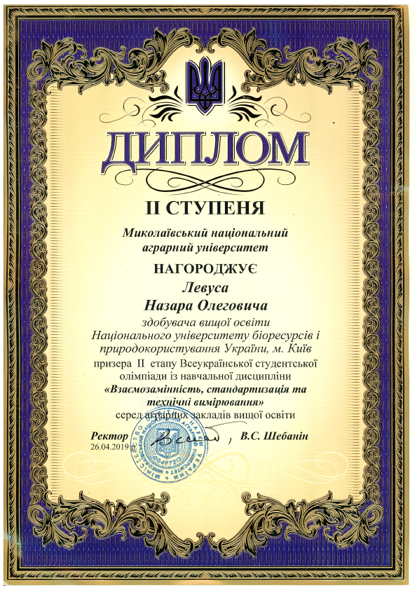 24-25 квітня 2019 року в Миколаївському національному аграрному університеті (м. Миколаїв) проводився ІІ-й етап Всеукраїнської студентської олімпіади з навчальної дисципліни «Взаємозамінність, стандартизація та технічні вимірювання».Участь в олімпіаді приймали студенти факультету конструювання та дизайну Національного університету біоресурсів і природокористування України Назар Левус та Олексій Сарган. Серед учасників були представники як аграрних навчальних вишів так і загальноінженерних. Серед аграрних навчальних вишів були представники із Києва, Харкова, Житомира, Дніпропетровська, Львова, Вінниці, Полтави, Кропивницького, Кам’янця-Подільського.Студенти факультету конструювання та дизайну Назар Левус виборов Диплом ІІ ступеню з навчальної дисципліни «Взаємозамінність, стандартизація та технічні вимірювання» серед аграрних закладів вищої освіти.
