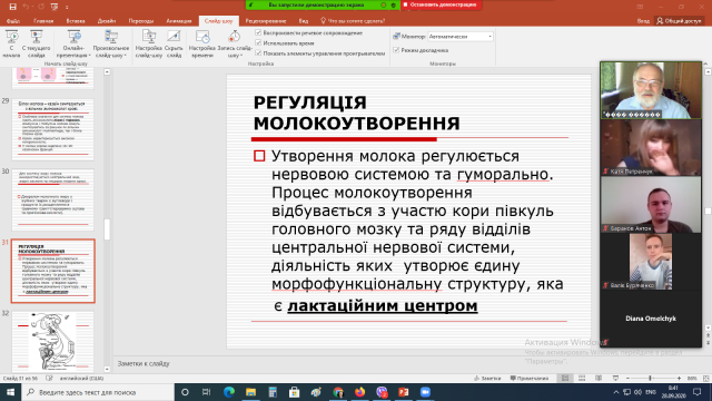 На цьому тижні студенти ІІ курсу факультету тваринництва та водних біоресурсів слухали заключну онлайн лекцію з фізіологія лактації. Під час дистанційної зустрічі лектор, проф. Віктор Трокоз розкрив питання регуляції молокоутворення та молоковіддачі, особливостей лактації у сільськогосподарських тварин різних видів, фізіологічних методів підвищення молочної продуктивності.