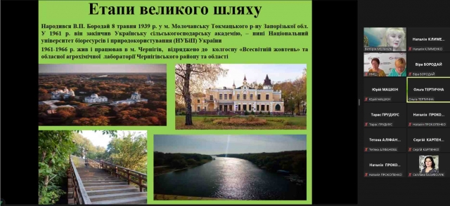 Про основні віхи життя і наукової діяльності професора В. Бородая розповіли Віра Бородай, доктор сільськогосподарських наук, доцент кафедри екобіотехнології та біорізноманіття НУБіП України і Ольга Тертична, доктор біологічних наук, старший науковий співробітник, провідний науковий співробітник лабораторії екології тваринництва Інституту агроекології і природокористування НААН України.