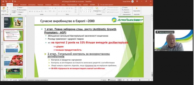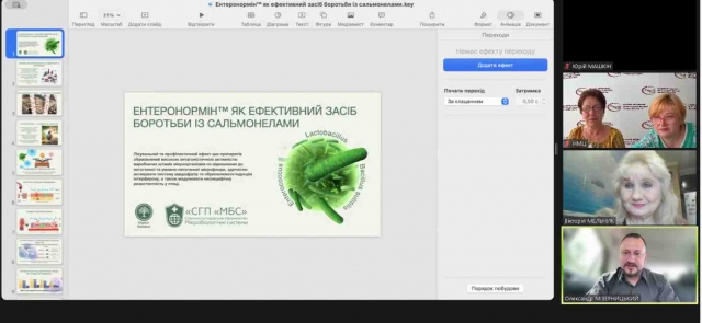 Юрій Машкін, кандидат сільськогосподарських наук, доцент кафедри технології виробництва продукції птахівництва та свинарства Білоцерківського НАУ, доповів про використання білково-мінеральної кормової добавки в годівлі курчат-бройлерів. Олександр Мізерницький, директор ТОВ «СГП «МБС», і Анастасія Дідовець, технічний керівник ТОВ «СГП «МБС», повідомили про ентеронормін як ефективний засіб боротьби із сальмонелами.