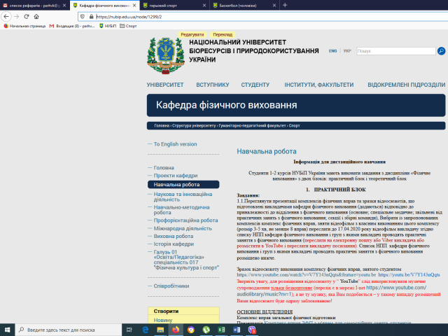 Колектив кафедри фізичного виховання підготував умови дистанційного навчання на період карантину для студентів 1-2 курсів НУБіП України. Умови викладені на сайті НУБіП України на сторінці: Кафедра фізичного виховання / Навчальна робота - інформація для дистанційного навчання (пряме посилання https://nubip.edu.ua/node/1299/2 ).
