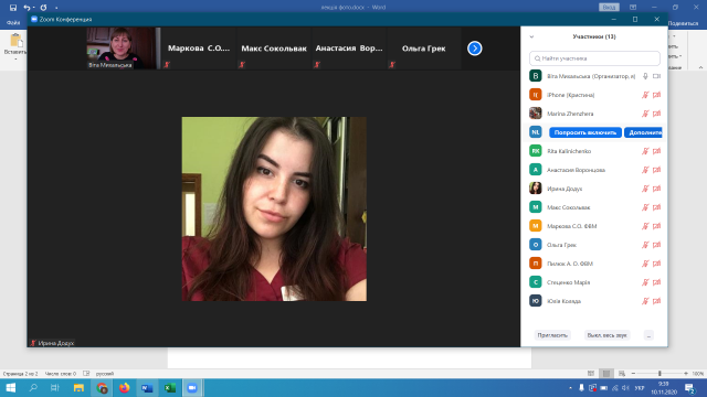 Також на даній зустрічі куратор групи Віта Михайлівна Михальська повідомила про графік заліків та іспитів і акцентувала увагу своєчасній здачі модулів і на тому, що на іспитах буде обов’язкова співбесіда on line. Так, залікова сесія почнеться з 30 листопада і буде тривати до 11 грудня 2020 року, а екзаменаційна – з 14 грудня по 30 грудня 2020 року.