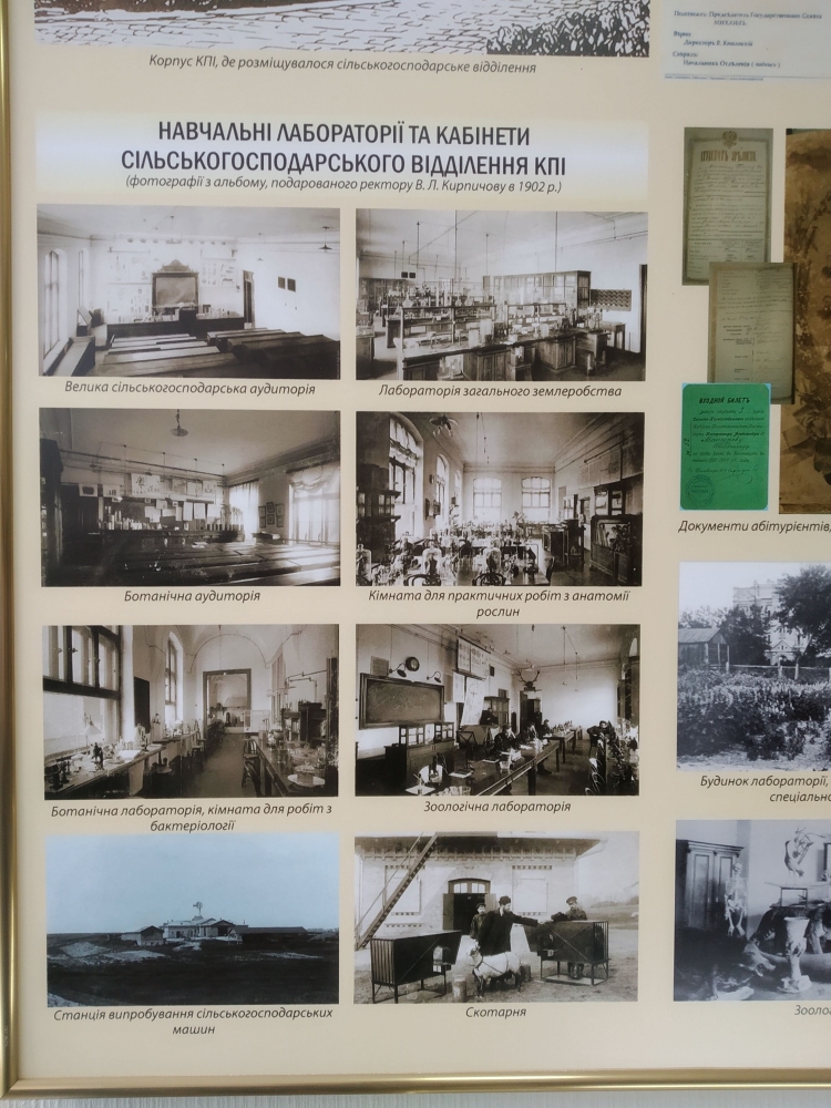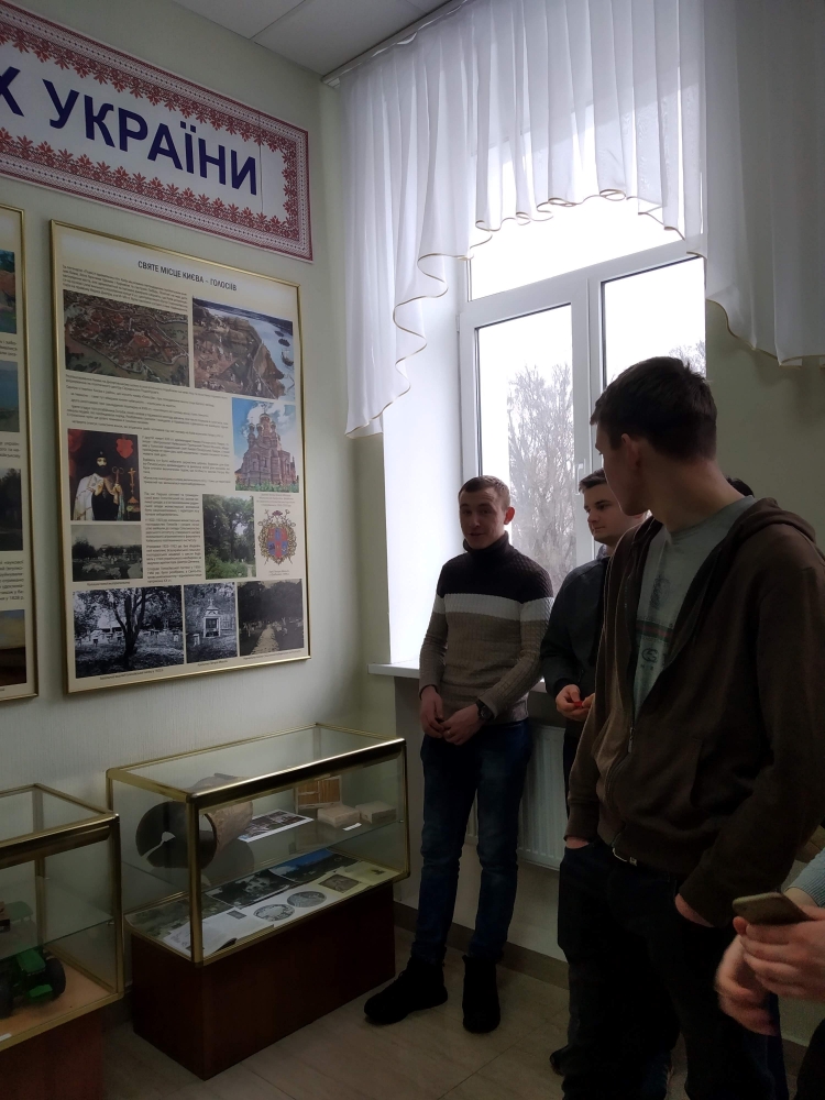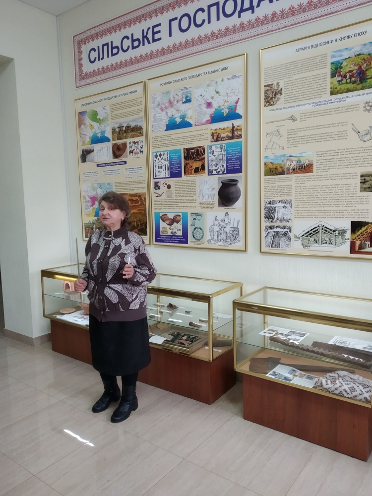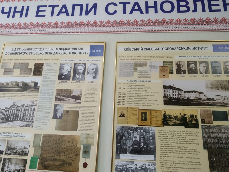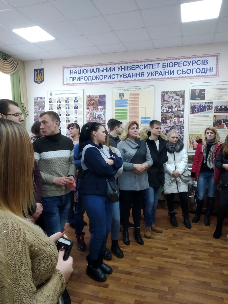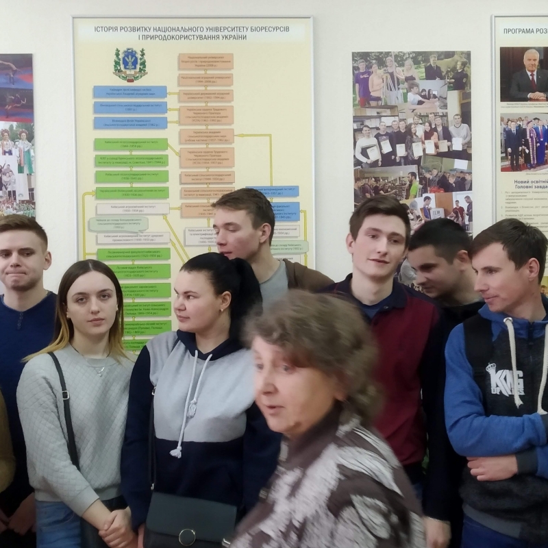Цікаву і змістовну розповідь про історію університету вчений секретар музею історії НУБіП України Чумак Т.М., яка була нашим провідником, розпочала зі становлення сільськогосподарської науки на теренах України. В експозиції музею представлені зразки трипільської культури, системи ведення землеробства, зародження тваринництва і т.д. По тому було викладено етапи виникнення, становлення і розвитку університету, як закладу вищої освіти, вказано на основні наукові досягнення кожного з них. Студентів зацікавили оригінали перших студентських квитків, залікових книжок, дипломів про освіту.