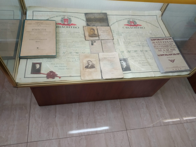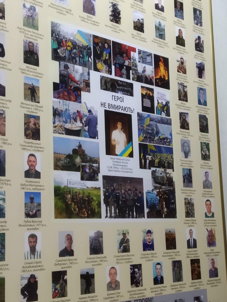 Говорячи про важкі випробування воєнних років, наш екскурсовод звернула увагу на те, що і сьогодні, коли йде війна на сході країни, студенти, аспіранти, викладачі університету не залишаються осторонь. Цілий стенд музею присвячено учасникам Революції Гідності і воїнам АТО.
