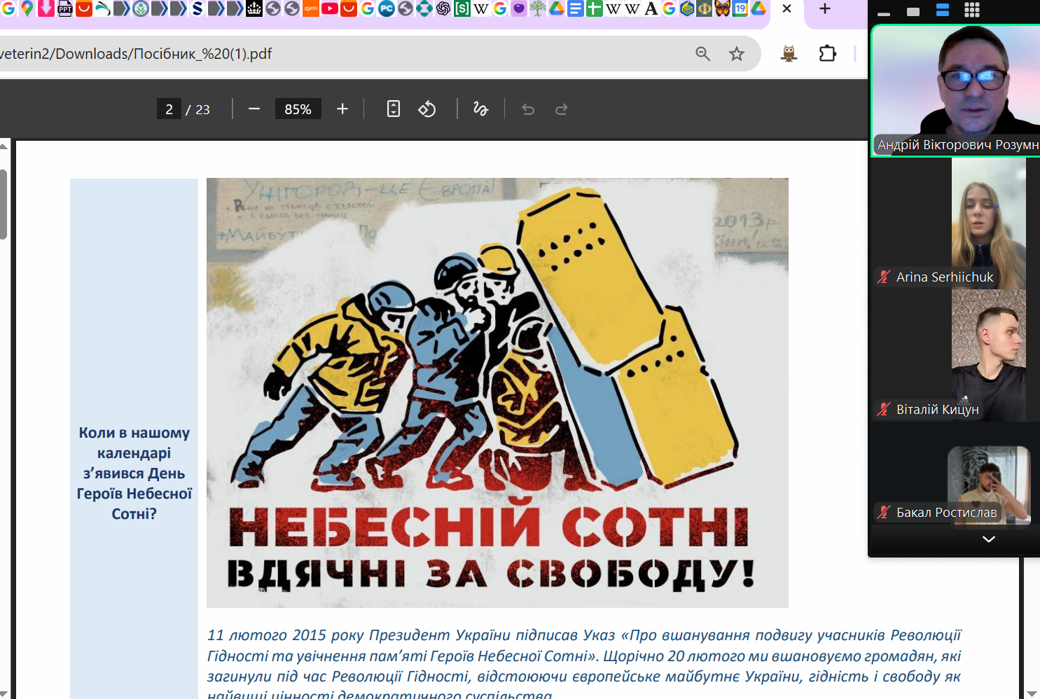 На знак вдячності і для вшанування пам’яті про волелюбних сміливих патріотів, 19 лютого 2026 року студенти 9 групи 4 курсу СК із наставником, доцентом кафедри внутрішніх хвороб тварин Розумнюком Андрієм Вікторовичем, провели онлайн зустріч, яку присвятили обговоренню вчинку, який надихає нас до стійкості, боротьби, як із зовнішніми, так і з внутрішніми ворогами.