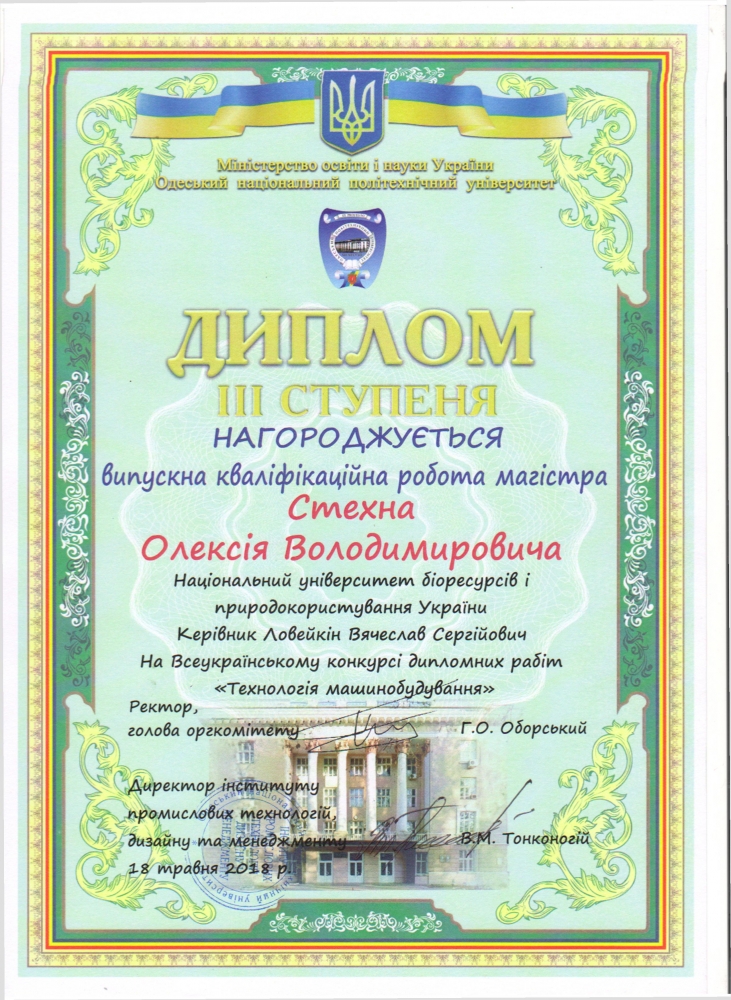 18 травня 2018 на базі Одеського національного політехнічного університету відбувся всеукраїнській конкурс випускних кваліфікаційних магістерськіх дипломних робіт зі спеціальності «Технологія машинобудування». Від факультету конструювання та дизайну була надіслана дипломна робота магістра Олексія Стехна «Оптимізація режимів зміни вильоту вантажу баштового крана з горизонтальною стрілою» (науковий керівник – д.т.н., проф. Ловейкін Вячеслав Сергійович). За результатами проведення конкурсу магістерська робота Олексія зайняла третє місце. Заступник декана