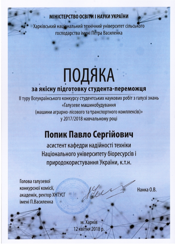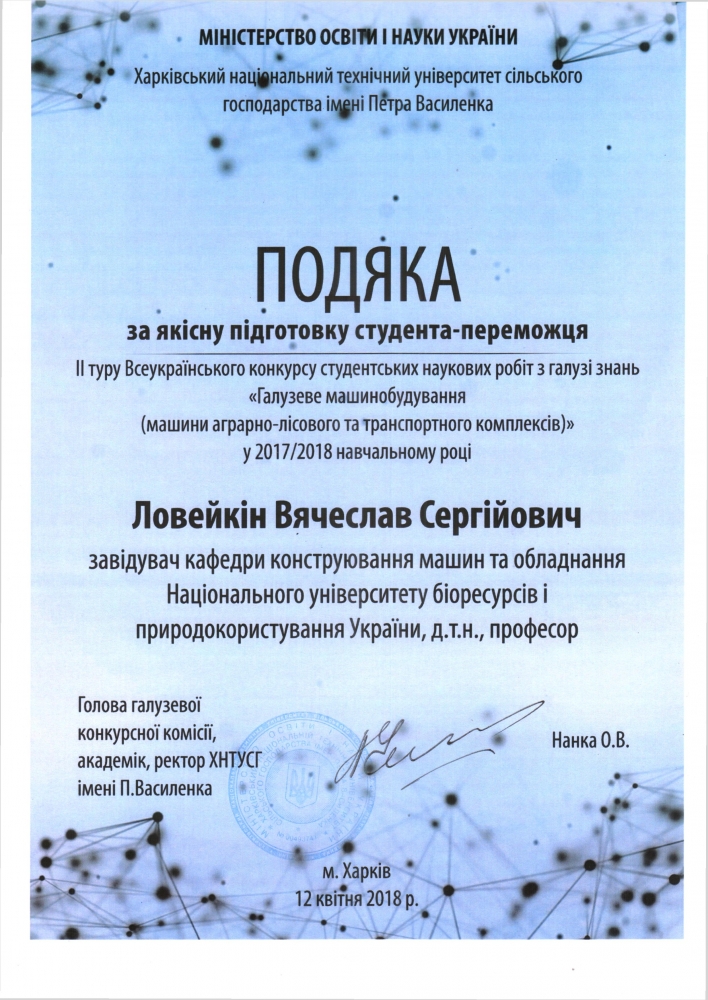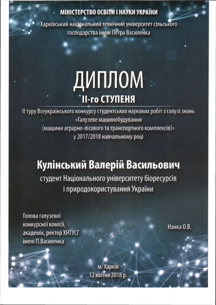 12 квітня на базі Харківського національного технічного університету сільського господарства імені Петра Василенка пройшов другий етап Всеукраїнського конкурсу студентських наукових робіт з галузі знань „Галузеве машинобудування (машини аграрно-лісового та транспортного комплексів)”. На заключному етапі конкурсу НУБіП України представляли магістр другого року навчання факультету конструювання та дизайну Валерій Кулінський (науковий керівник проф. Ловейкін В.С.) та студент четвертого курсу цього ж факультету Руслан Гарбуз (науковий керівник Попик П.С.).