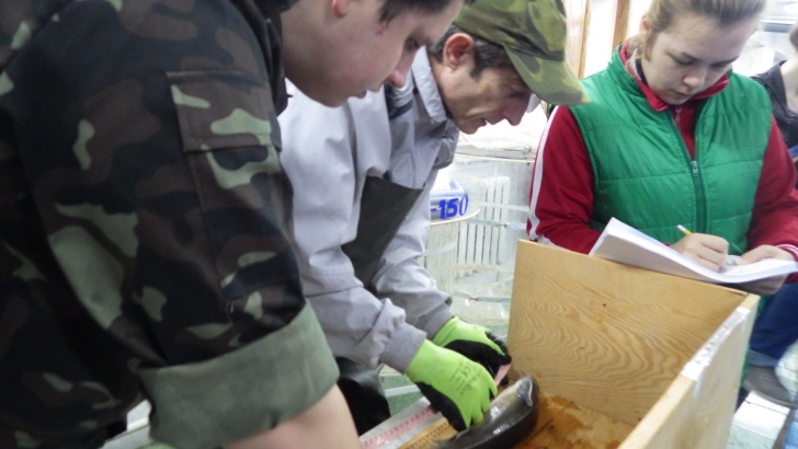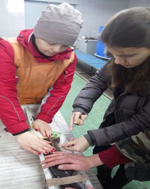 кафедри аквакультури Поплавська Олена беруть пробу гонад у самиці стерляді