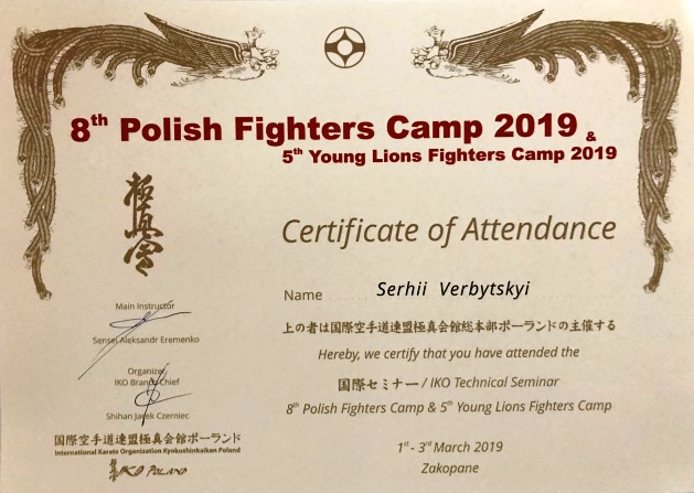 З 1 по 2 березня 2019 року в місті Закопане, Республіка Польща під егідою Міжнародної федерації кіокушин карате відбувся міжнародний табір з підвищення кваліфікації тренерів та спортсменів категорії «майстер».