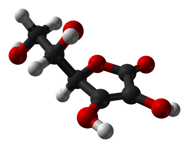 Модель L-аскорбінової кислоти (вітамін С), C6H8O6, представлена в кристалічній структурі. Дані рентгенівської дифракції від J. Mol. Struct .: THEOCHEM (1997) 419, 139-154. Модель, побудована в CrystalMaker 8.1. Зображення, створене в Accelrys DS Visualizer.